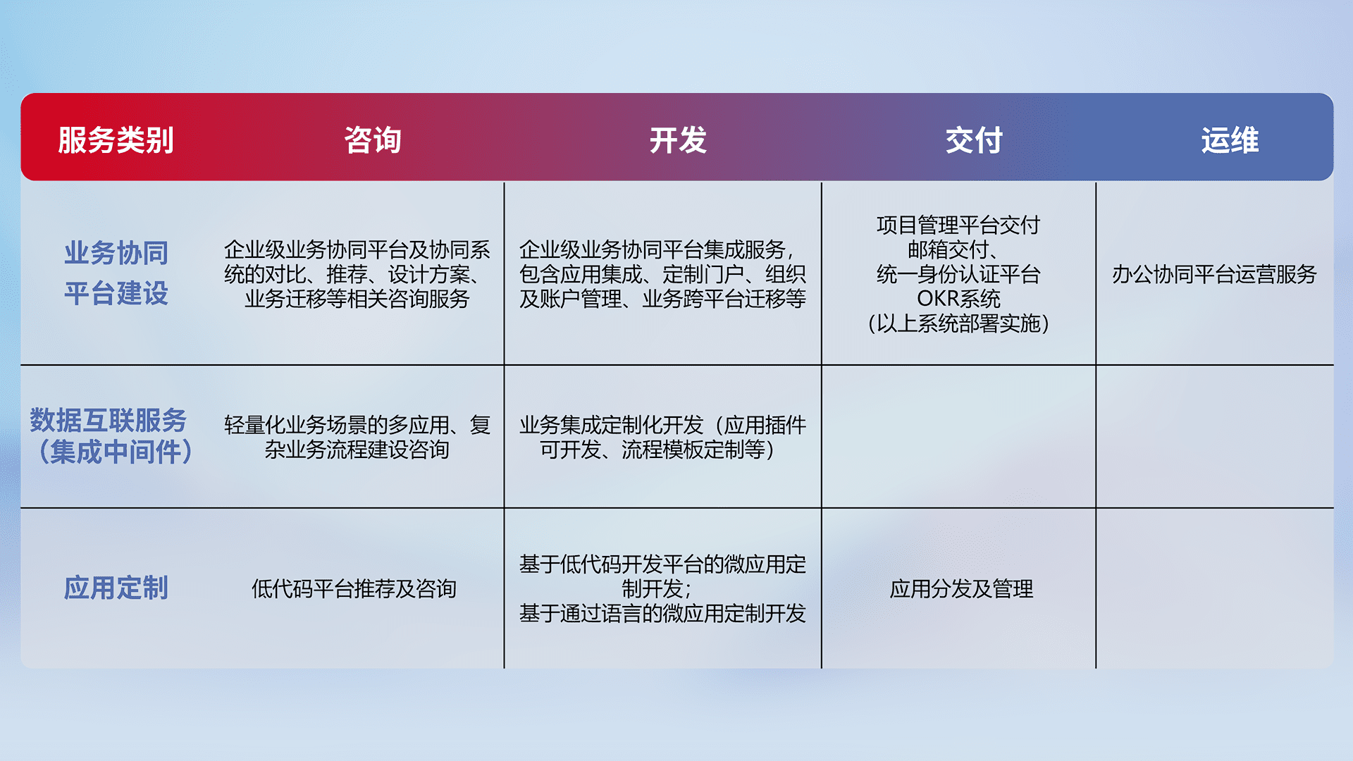 针对钉钉、、、、企微、、、、IDaas等平台级产品提供产品的规划、、、、方案、、、、交付、、定制化开发等服务,,,,实现如统一协同办公、、、智能客户服务、、、混合会议管理、、、智能数据查询、、、等业务场景,,,实现数字化转型。。。。