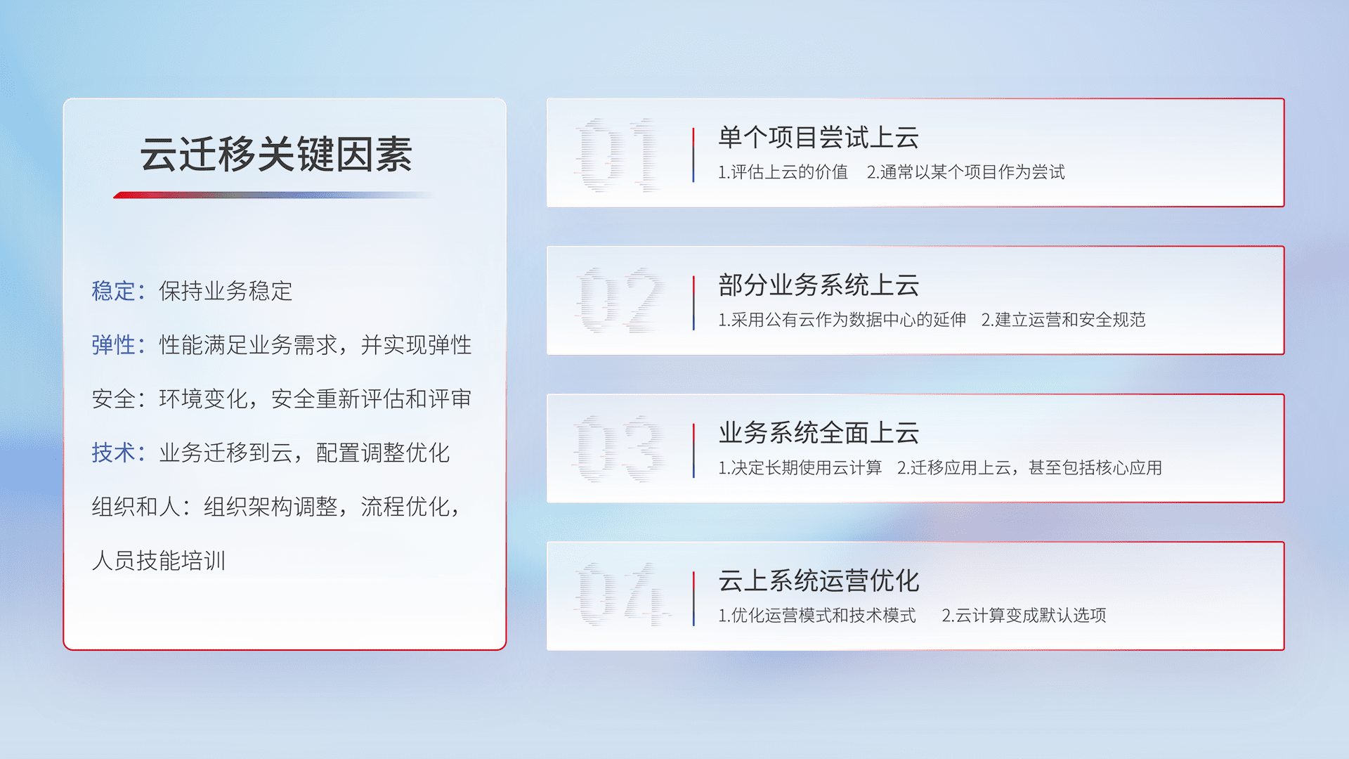 结合实际业务,,,,从规划设计、、、、云平台选型、、云原生改造、、、、数据迁移、、、集成交付,,,迁移全过程为客户识别最佳上云路径,,,,做好风险识别管理,,设计网络架构、、身份权限、、、、安全审计合规、、、操作审计、、日志审计、、、、监控告警策略、、、多站点容灾设计等,,,对云上基础设施进行整体规划,,提升IT治理水平,,,以满足弹性、、、、高可用、、、高性能的需求。。。。