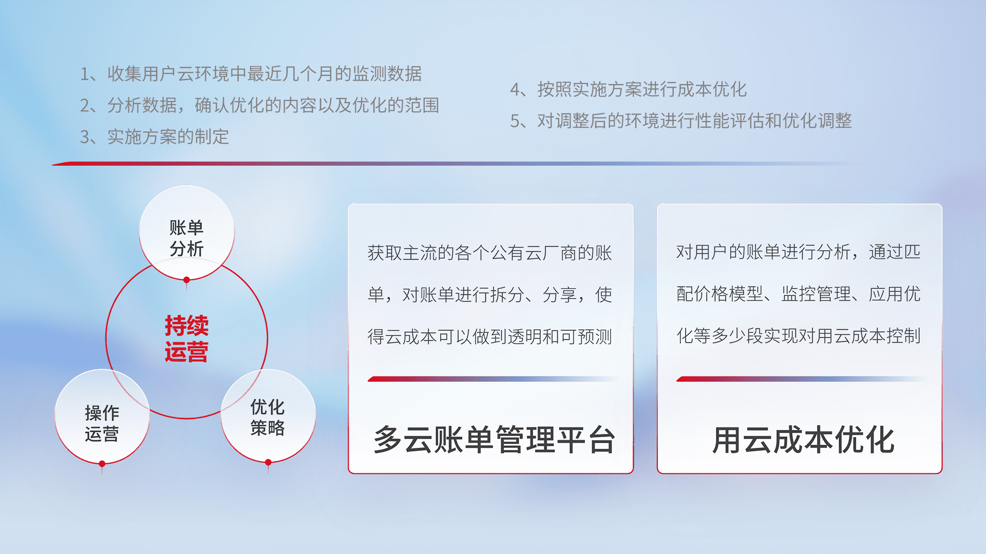 通过多云纳管,,以统一的资源数据模型把客户的云资源进行抽象和封装,,,进而实现对多云资源的统一操作,,保障云资源管理的可靠性、、、稳定性与可用性。。。。量身定制化运维内容,,,配置、、、、开发运维、、、补丁管理、、、备份、、、监控、、认证和访问管理、、、、审计和日常巡检等,,,保障在用云过程中的可靠度,,,稳定度以及高可用率。。。