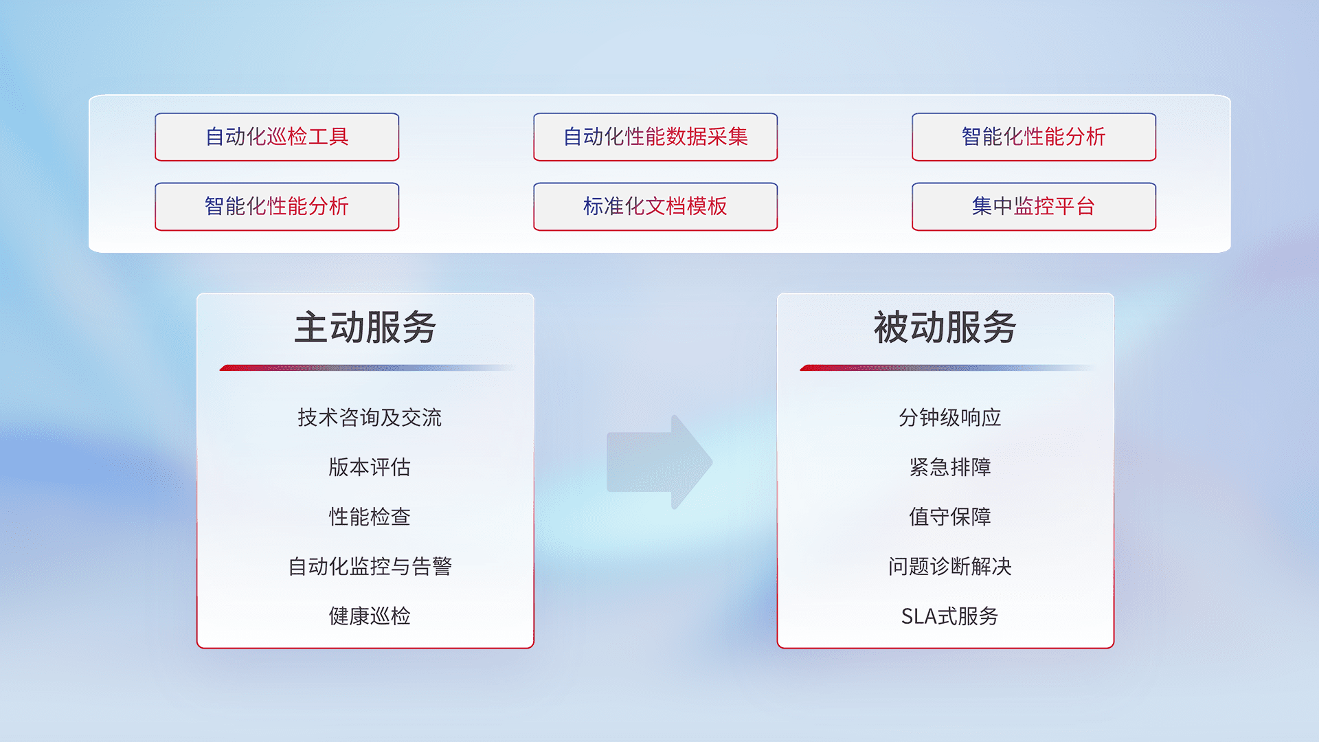 智能化工具和标准化文档,,保障服务质量,,提供主动服务(包含技术咨询、、、、版本评估、、、性能检查、、、、自动化监控与告警、、健康巡检)和被动服务包含(分钟级响应、、紧急排障、、、、值守保障、、、问题诊断解决、、SLA服务)。。。。